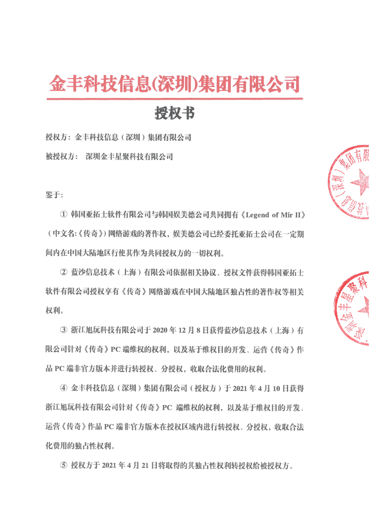 2021年4月10日,1号娱乐集团获得浙江旭玩科技有限公司独占性授权,获得《热血传奇》共有著作权人亚拓士公司的授权。至此1号娱乐集团成为国内唯一获得亚拓士、娱美德共同授权的合法代表。