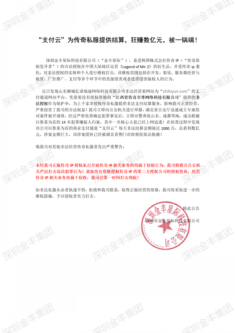 未经我司正版传奇IP授权私自开展传奇IP相关业务的均属于侵权行为,我司将联合公安机关严厉打击违法犯罪行为!获取没有资格授权传奇IP的第三方授权公司的授权资质,经营传奇IP相关业务也属于侵权,我司会第一时间打击到底!