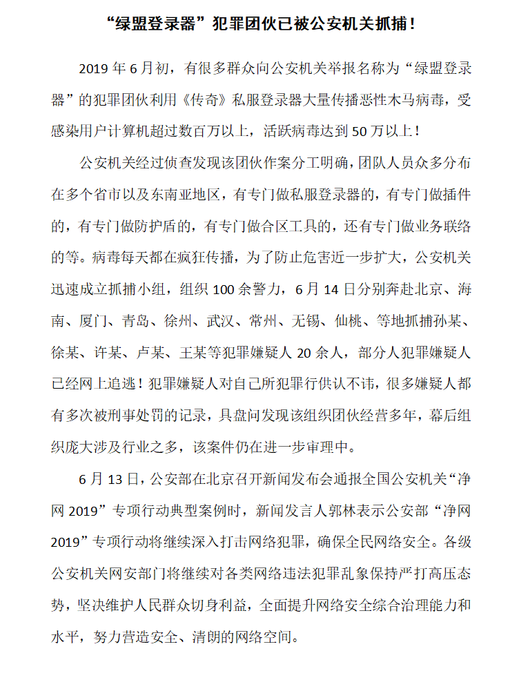 绿盟登录器”犯罪团伙已被公安机关抓捕!